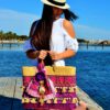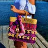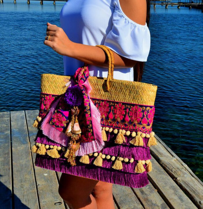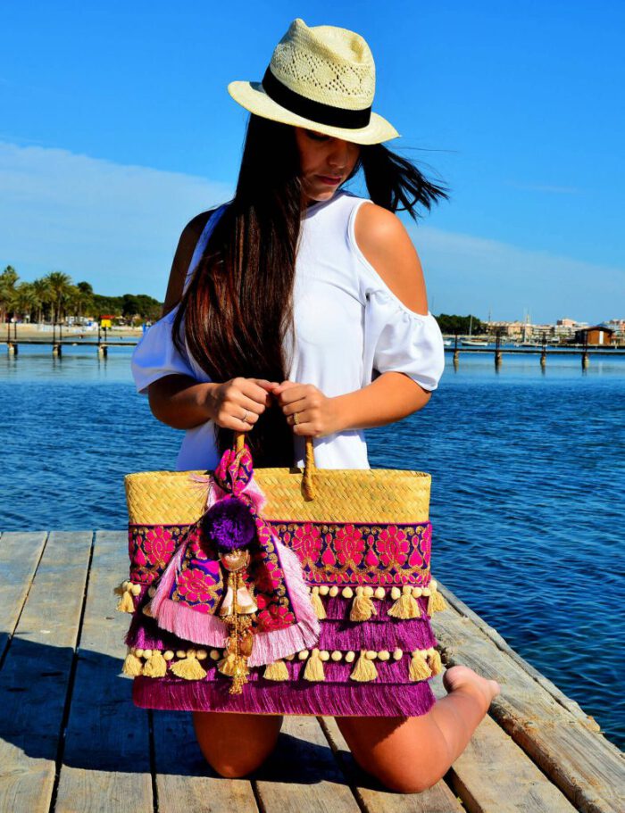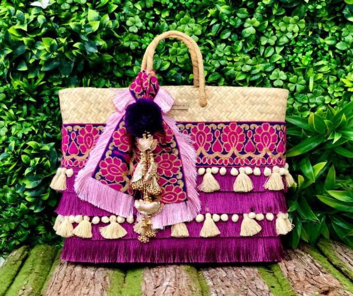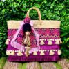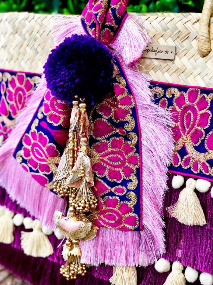 Bolso de palma de primera calidad con bordado, flecos y borlas en tonos morados y turquesa.Adornado con pompón y tassel  hindú.
