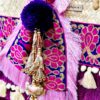 Premium palm bag with embroidery, fringes and tassels in purple and turquoise. Decorated with pompom and Indian tassel.