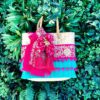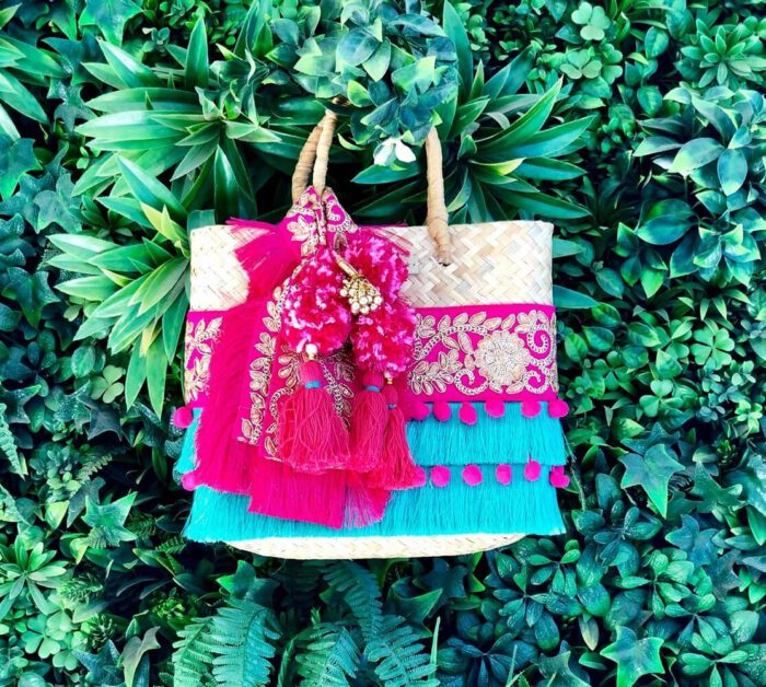 Bolso de palma de primera calidad con bordado, flecos y borlas en tonos fucsia y turquesa, adornos de pompones y tasel hindú. Cierre metálico tipo imán.
