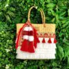 Bolso de palma de primera calidad con bordado, flecos y borlas en tonos rojo y blanco. Cierre metálico tipo imán.