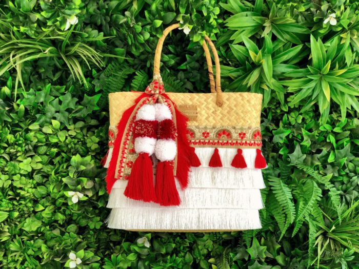 Premium palm bag with embroidery, fringes and tassels in red and white. Metallic magnet closure.