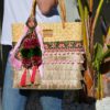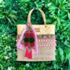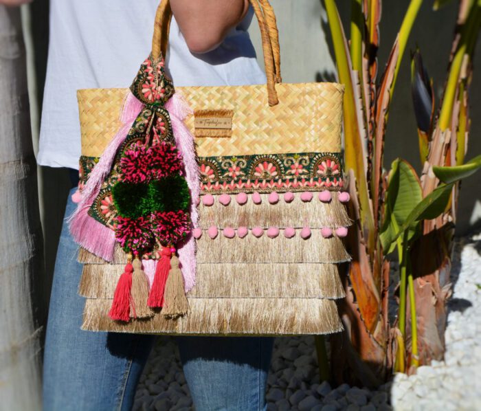 Bolso de palma de primera calidad con bordado, flecos y borlas en tonos beige y rosa. Cierre metálico tipo imán.